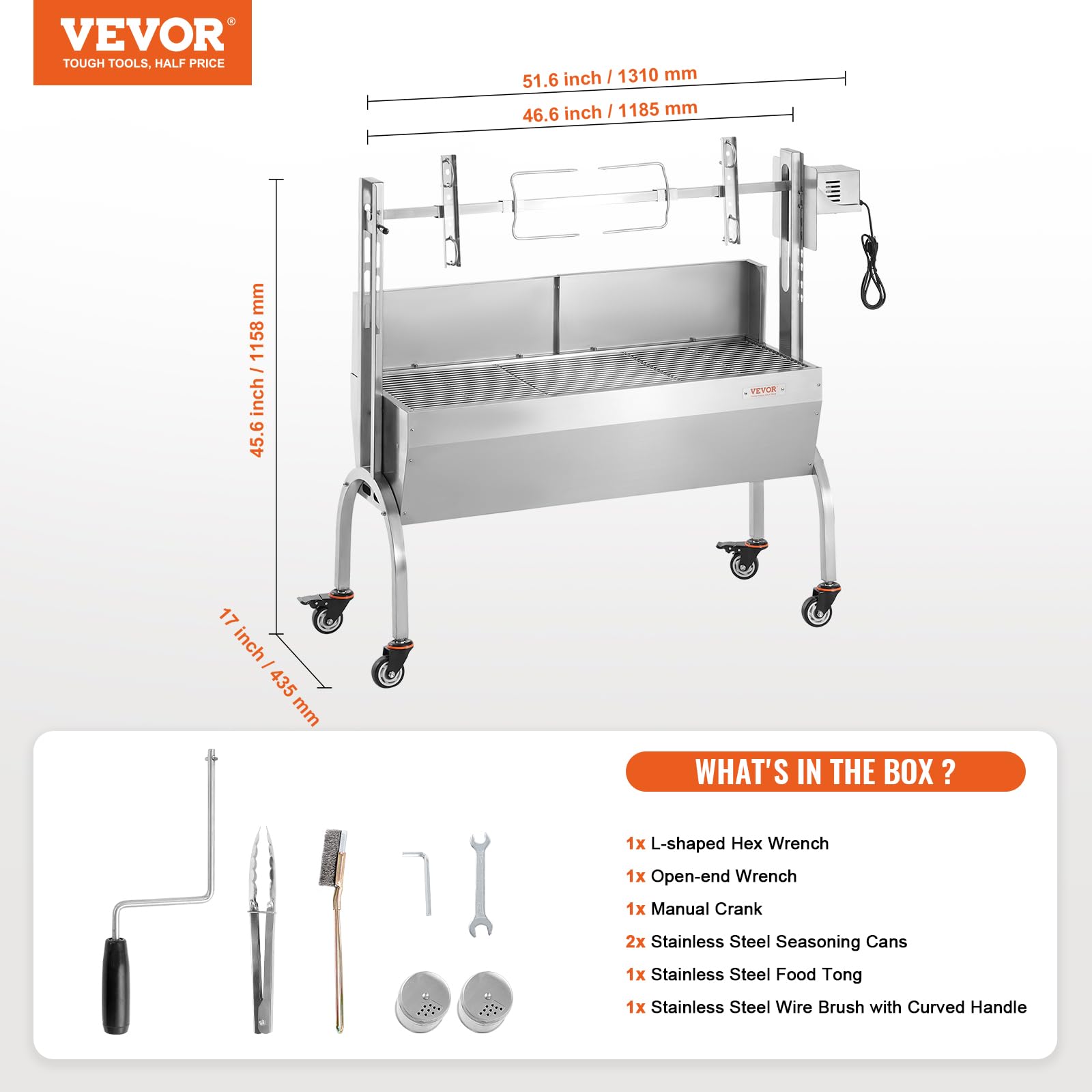 - User-Friendly Design: The stainless steel rotisserie roaster comes with 4 detachable and lockable wheels, making it easier to move and providing more stability while cooking. Additionally, it includes 2 seasoning bottles, tongs, and a brush, making it the perfect grill for open flame and rotisserie cooking. The metal-edged windshield ensures the flame stays lit, making it more convenient to use.