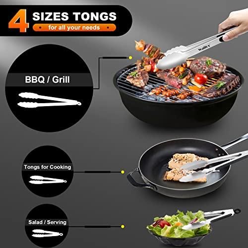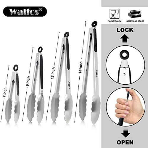 Walfos Stainless Steel Kitchen Tongs for Cooking, BBQ - 7 ,9, 12 and 14 Inch,Set of 4 Heavy Duty Locking Metal Food Tongs Non-Slip Grip