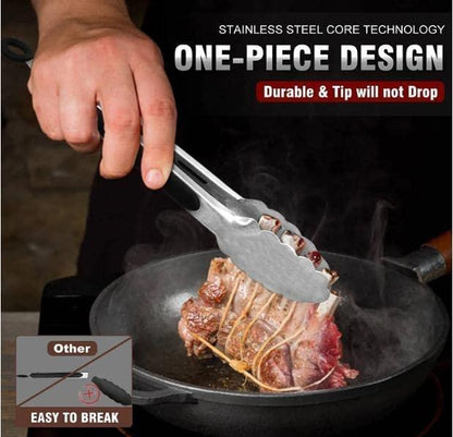 - ★ERGONOMIC HANDLE DESIGN AND HEAT RESISTANT-The handle is cushioned with non-slip silicone,great for thumb rest,and ensures handle grip and control.The metal tong head is super heat resistant.Easy to rinse, dishwasher safe and easy to clean.