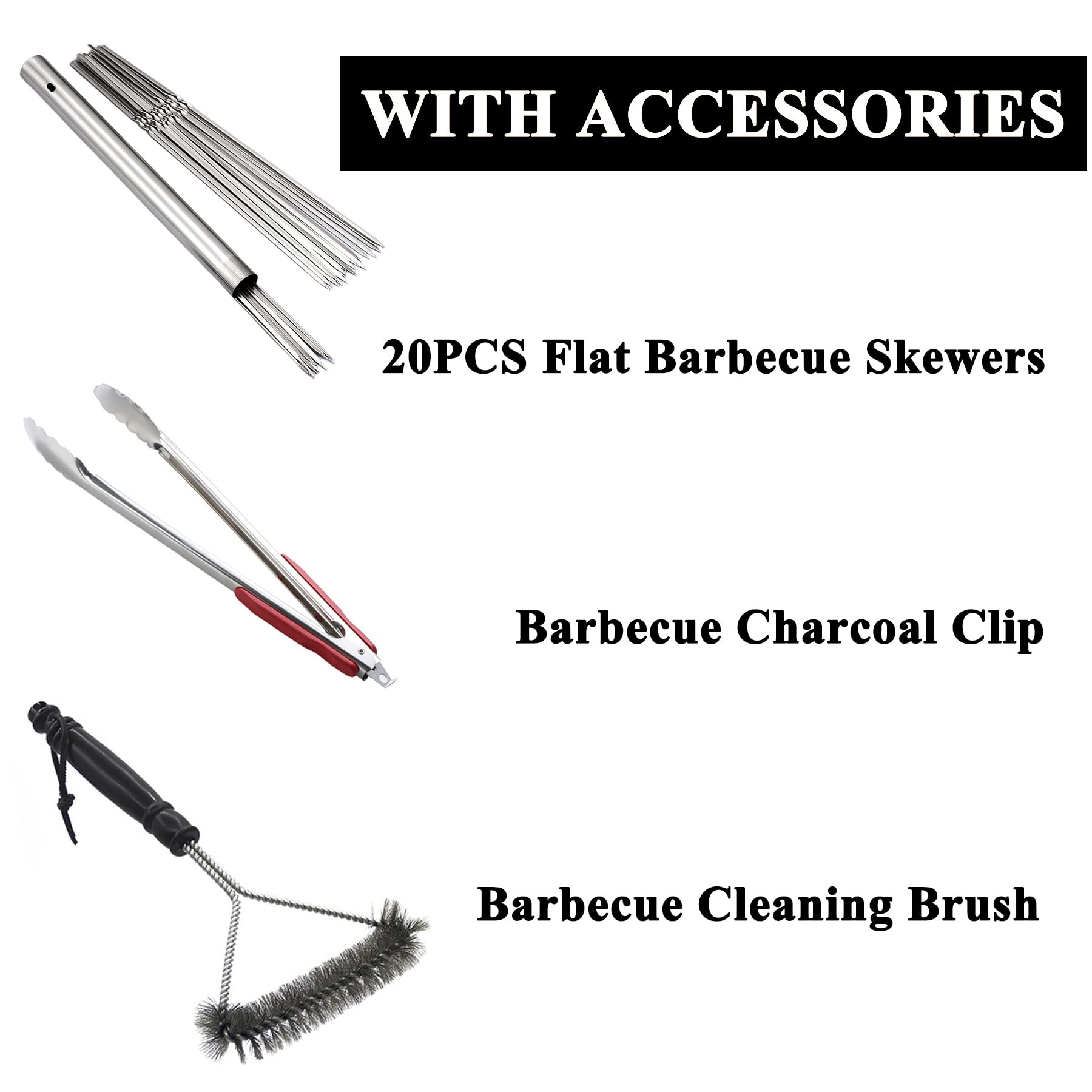 - 【With Barbecue Accessories】Equipped with 20PCS reusable 13.2 "/33.5cm long stainless steel flat barbecue skewers with portable metal storage tubes.There is also a barbecue charcoal clip and a barbecue cleaning brush.you can make delicious kebab, yakitori and Chinese lamb skewer as soon as you receive it.