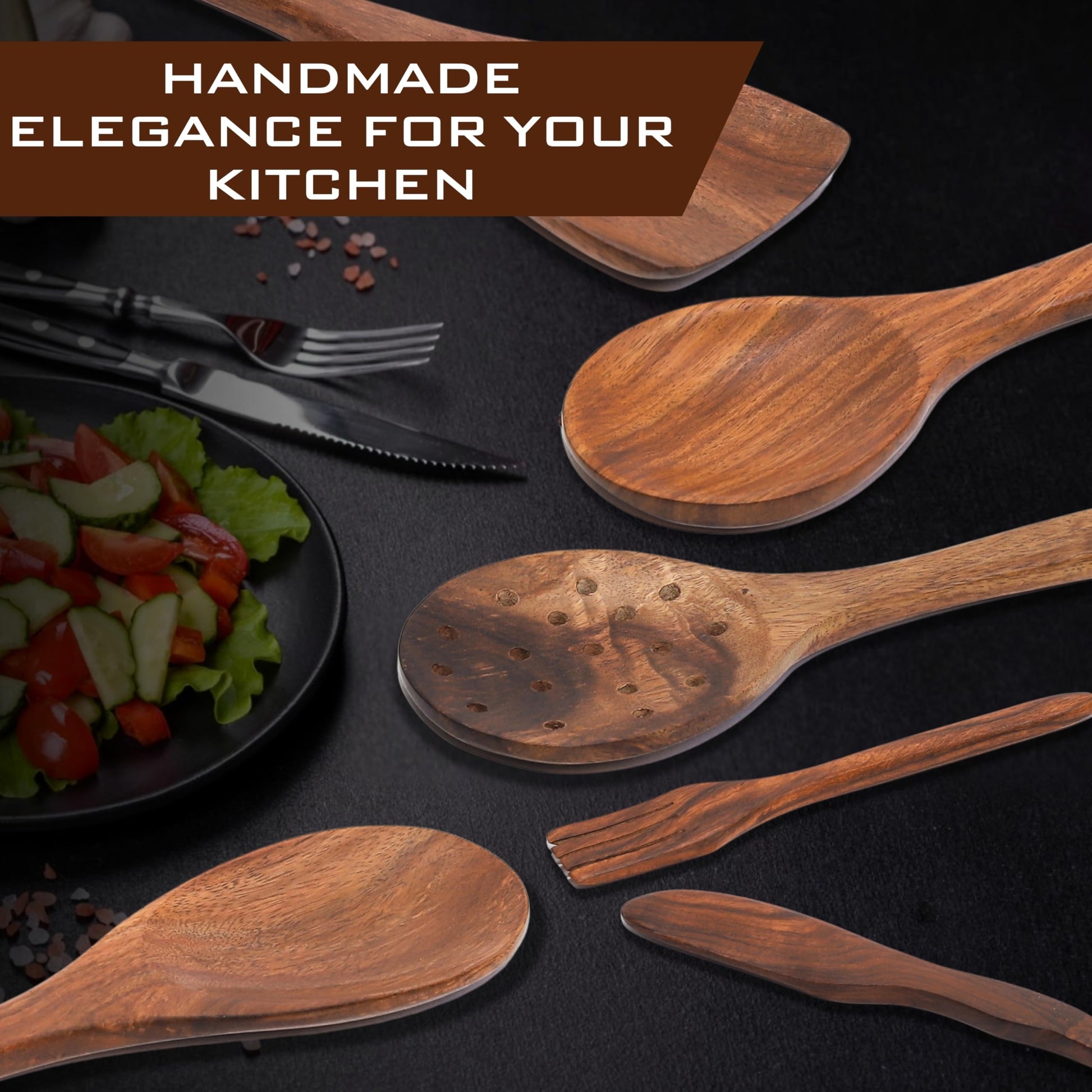 Wooden Cooking Spoons – 8 Pcs Teak & Acacia Wood Kitchen Utensil Set with Rotating Holder, Spatulas, Salad Fork, Skimmer, Spoon Rest, Wooden Knife – Nonstick, Heat-Resistant, Natural Utensils
