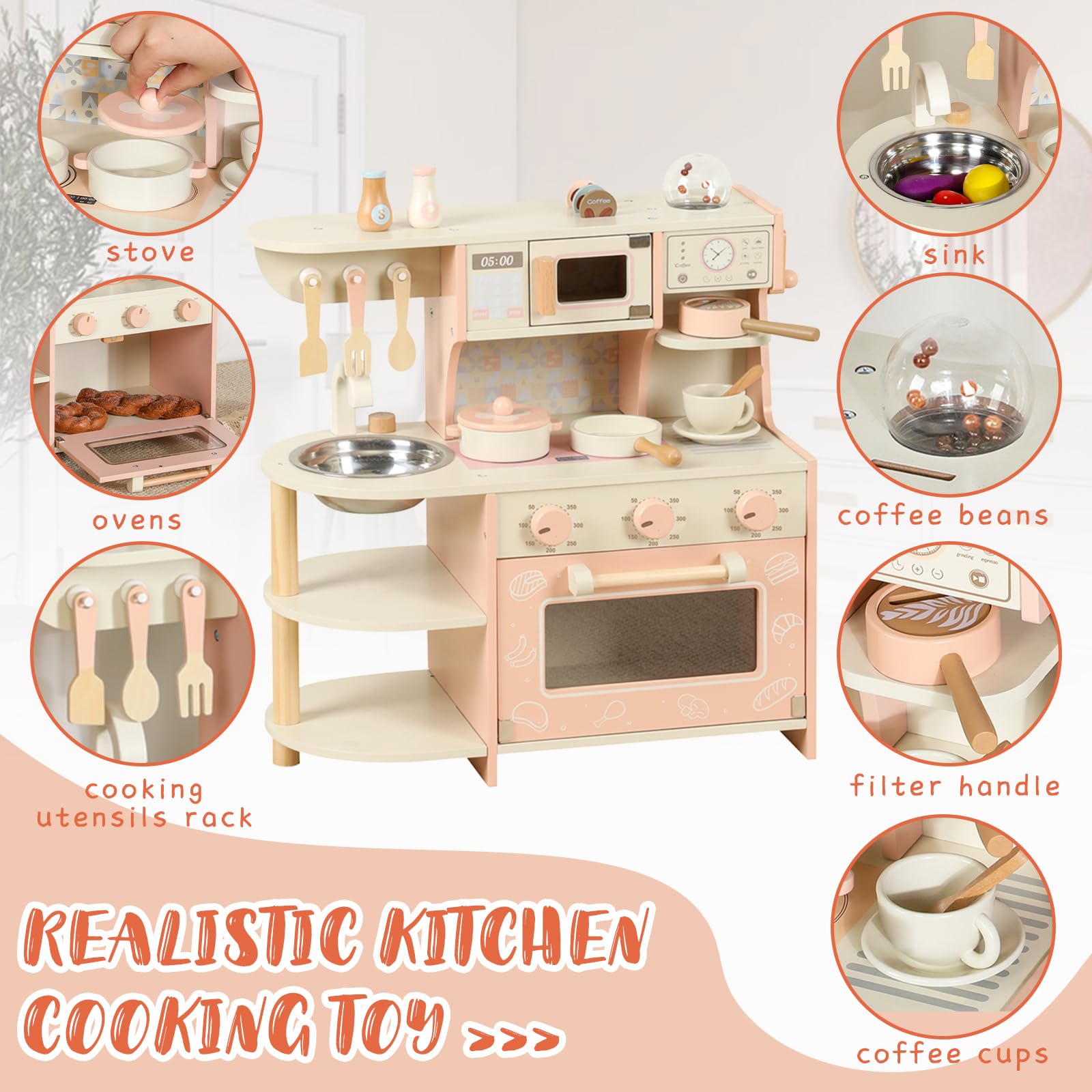 - DELUXE PRETEND KITCHEN: Our deluxe pretend play kitchen is packed with features to inspire imaginative roleplay. With a realistic coffee maker, oven, microwave, sink and 16 pcs cooking accessories, kids can take orders, heat up pretend food, and wash dishes just like their favorite chefs on TV!