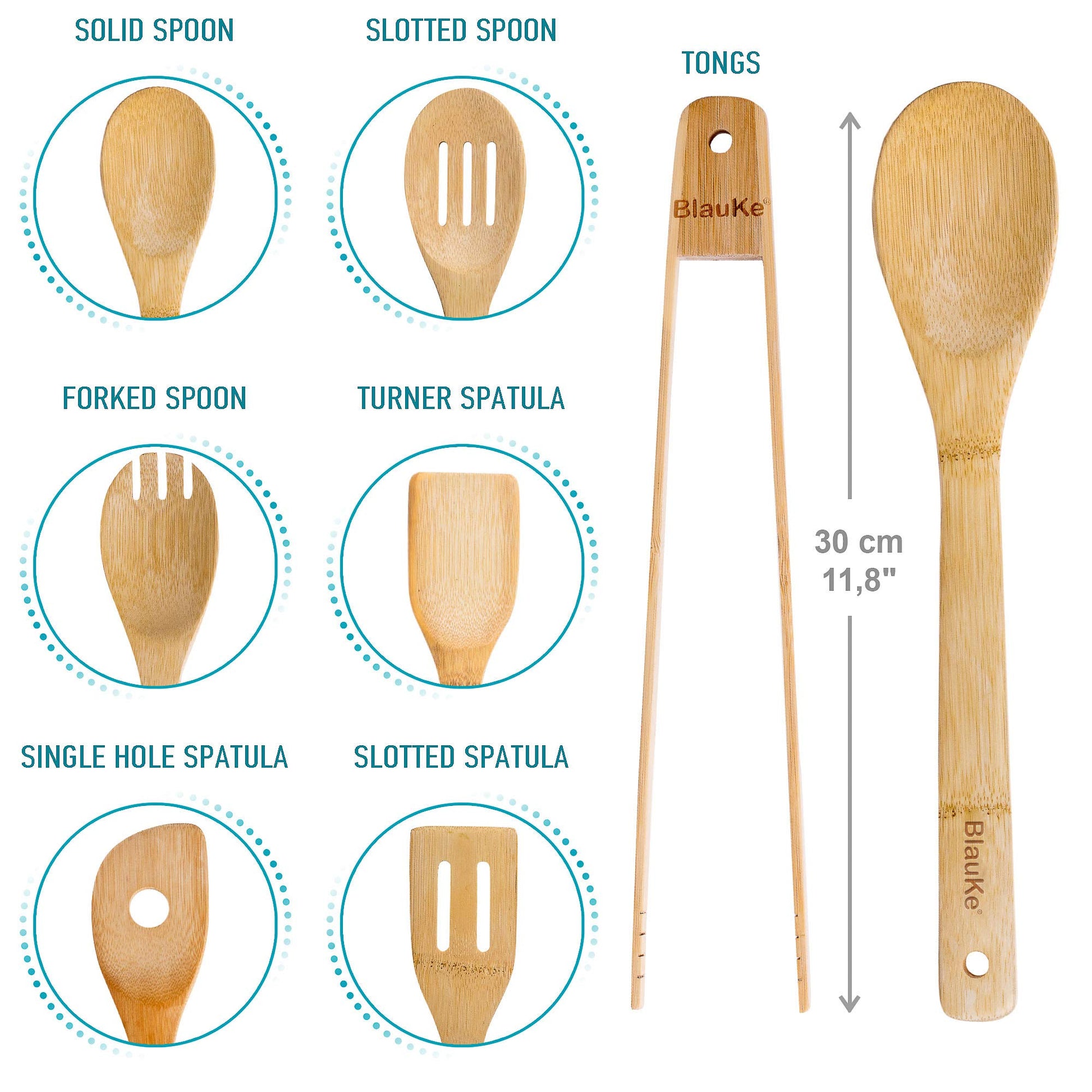- Bamboo kitchen utensils set includes: wooden spatula for cooking, single hole mixing spoon (spaghetti spoon), slotted spoon, slotted spatula, wooden cooking spoon, forked spoon, kitchen tongs