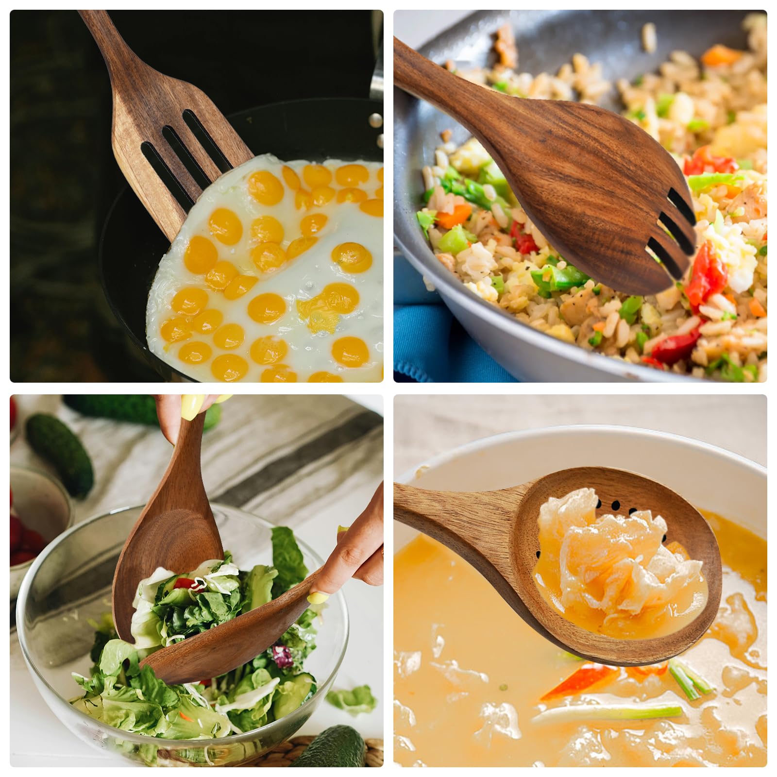 - Wooden Utensil Set: This 8pcs kitchen utensils set includes: salad fork, salad spoon, frying spatula, slotted spoon, oil spoon, soup spoon, spatula, slotted spatula. Multifunctional kitchen tool set for various needs.