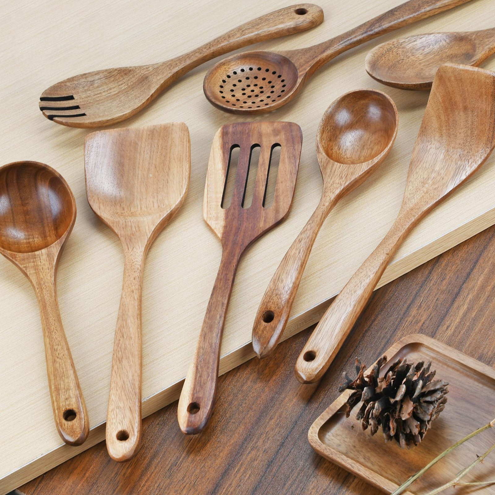 - Material: The utensils set is made of teak wood, non-toxic and eco-friendly. Non-crack and non-deformation, strong and durable, perfect wooden spoons set for cooking.