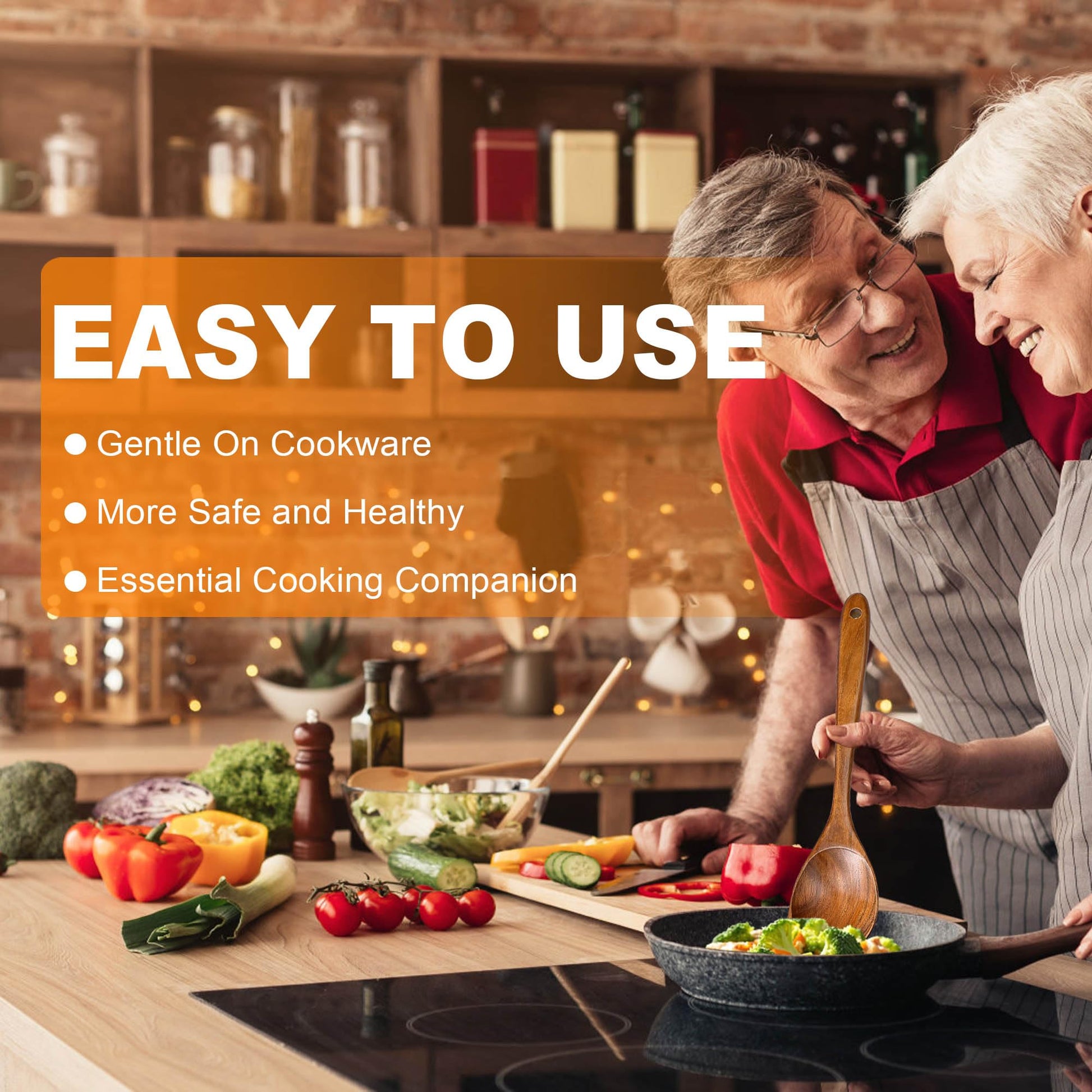 - FOR YOUR NON-STICK PANS - Our wood utensils feature smooth, rounded edges that glide across delicate surfaces without scratching. Protect your premium cookware’s coatings while enjoying superior heat resistance – teak’s natural density prevents warping even when used with high-temperature cooktops.