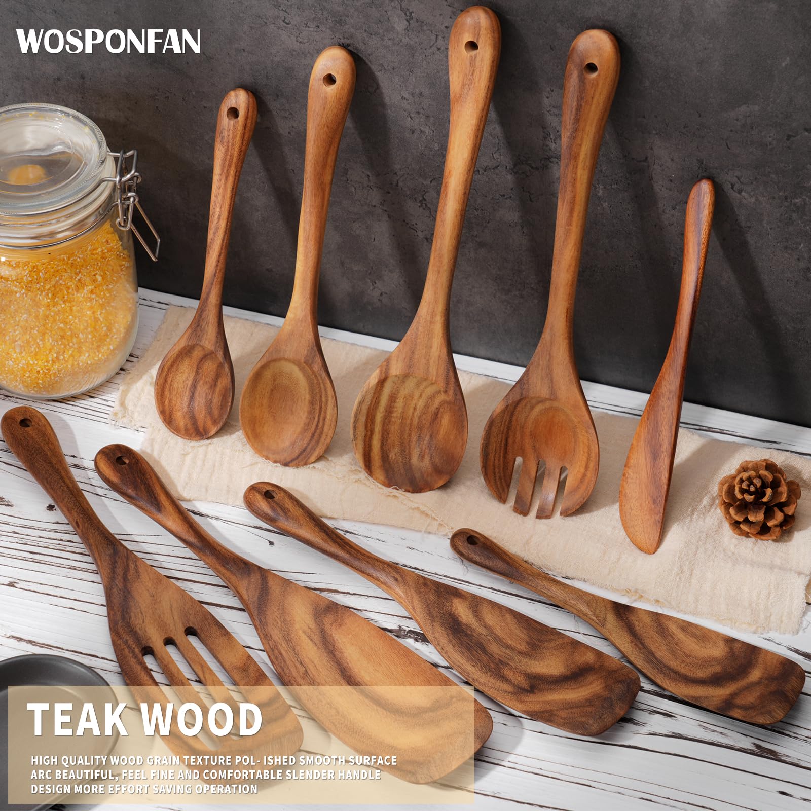 WOSPONFAN Wooden Cooking Utensils Set, 9 PCS Teak Wood Spoons, Spatula, Slotted Spoon, Handmade Modern Kitchen Utensils