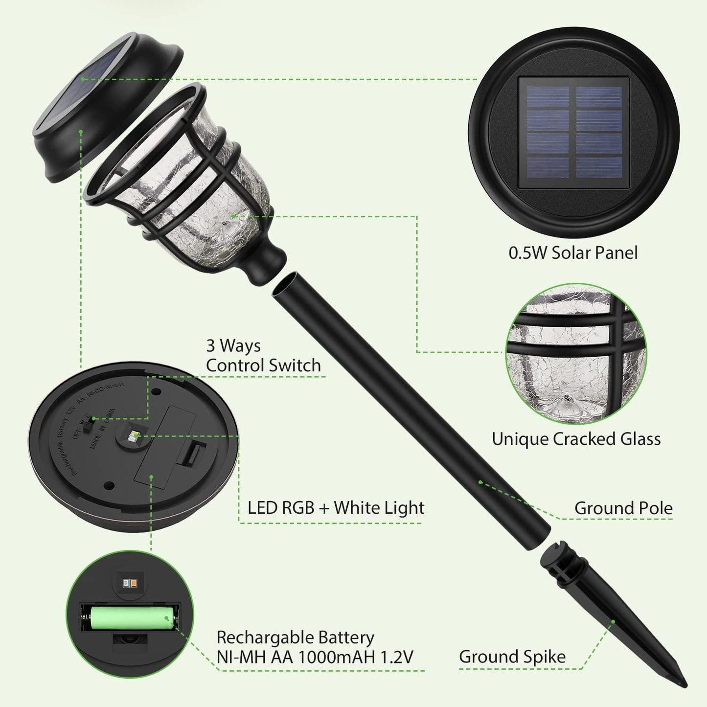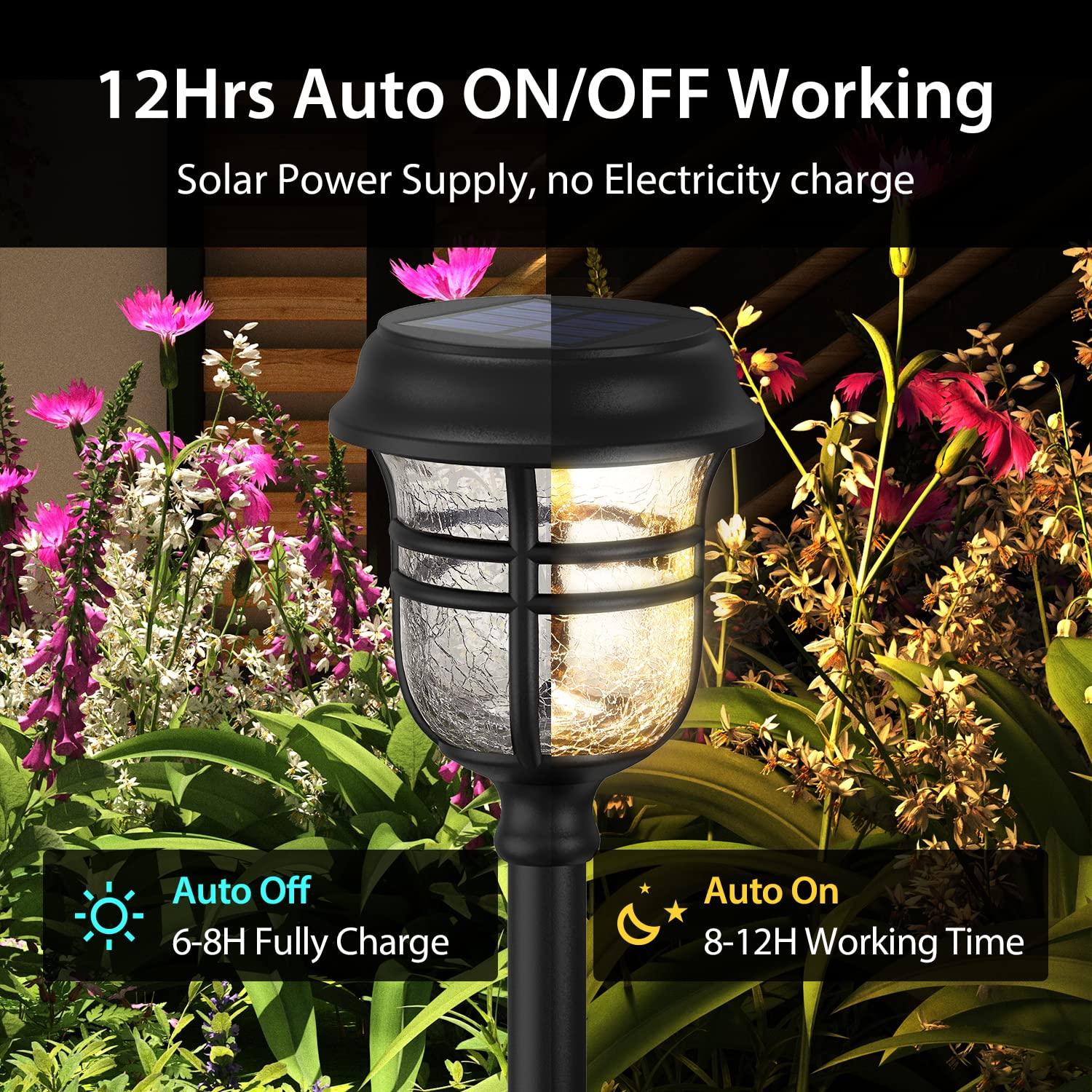 - đăEco-friendly, Energy Saving Landscape Path Lightsă 360° radial illumination 4.75" Dia solar outdoor lighting and recycled energy reduces environmental pollution without having to increase your electricity bills. Directly solar powered by the sun, 1.2V AA 1000mAH Ni-MH rechargeable batteries 5-6 hours of sunlight charging during the day, outdoor garden lights can bring up to 8-12 hours of lighting at night. (TIPs: Ensure solar lights outdoor absorb 10 hours of full sunlight on the first day)