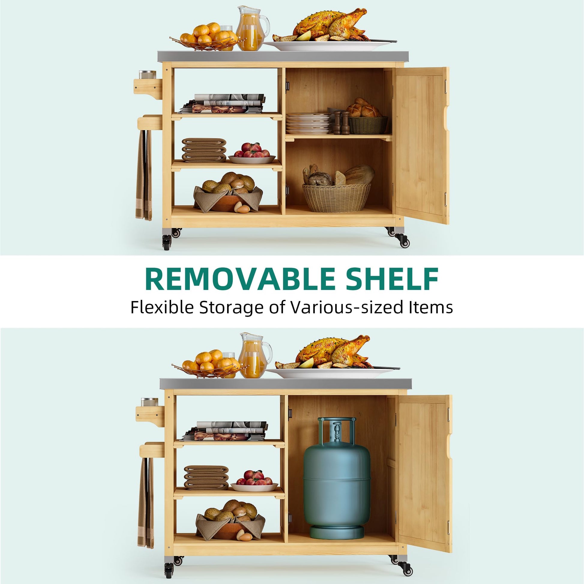 - Multifunctional Design: Multipurpose hosting solution that allows you to hold your food and drinks or perform other duties for your party or BBQ. You can use it as a BBQ grill cart, an outdoor bar, a serving cart, a prep table, or a kitchen island.